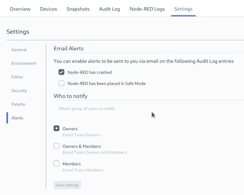 The newly introduced feature offers email notifications tied to particular Audit log events, available to all users with Pro Tier access or higher. This feature is designed to facilitate immediate notification and action in response to Node-RED Instance crashes. For detailed information and guidance on this functionality, please refer to our documentation.